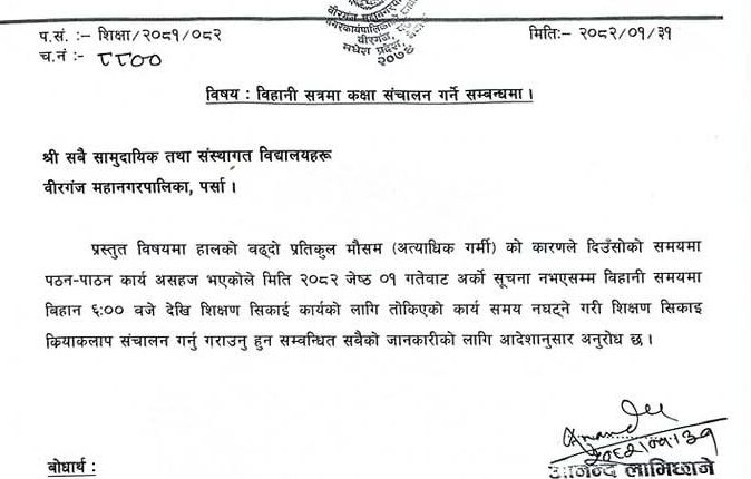 अत्यधिक गर्मीका कारण वीरगञ्ज महानगरपालिकाद्धारा महानगर क्षेत्रभित्रका सबै विद्यालयको समयतालिका परिवर्तन
