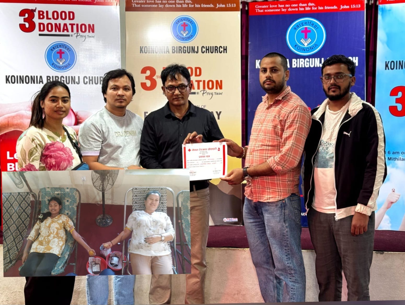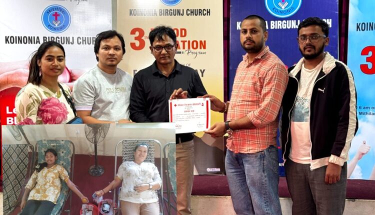 बिरगञ्ज — क्वाइनोनिया बिरगंज चर्चले बिरगञ्ज–१६ मिथिलानगरमा “रक्तदान नै जीवनदान हो” भन्ने नारासहित रक्तदान कार्यक्रम आयोजना गरेको छ। कार्यक्रममा २३ महिला सहित ७९ जनाले रक्तदान गरेका छन्।