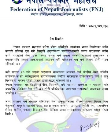 काठमाण्डौ । धनुषास्थित जनकपुरधाममा पत्रकारमाथि भएको भौतिक आक्रमणको घटनापछि नेपाल पत्रकार महासंघ केन्द्रीय समितिले अध्ययन प्रतिवेदनका लागि विशेष मिसन गठन गरेको छ।