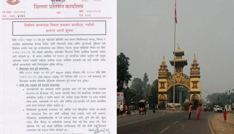 प्रशासनले फागुन १८ गते (२ मार्च २०२६) सोमबार राति १२ बजेदेखि फागुन २१ गते (५ मार्च २०२६) बिहीबार राति १२ बजेसम्म पर्सा जिल्लासँग जोडिएका भारतीय सीमाना पूर्ण रूपमा बन्द रहने जनाएको छ। निर्वाचन अवधिभर आवतजावतमा कडाइ गरिने बताइएको छ।