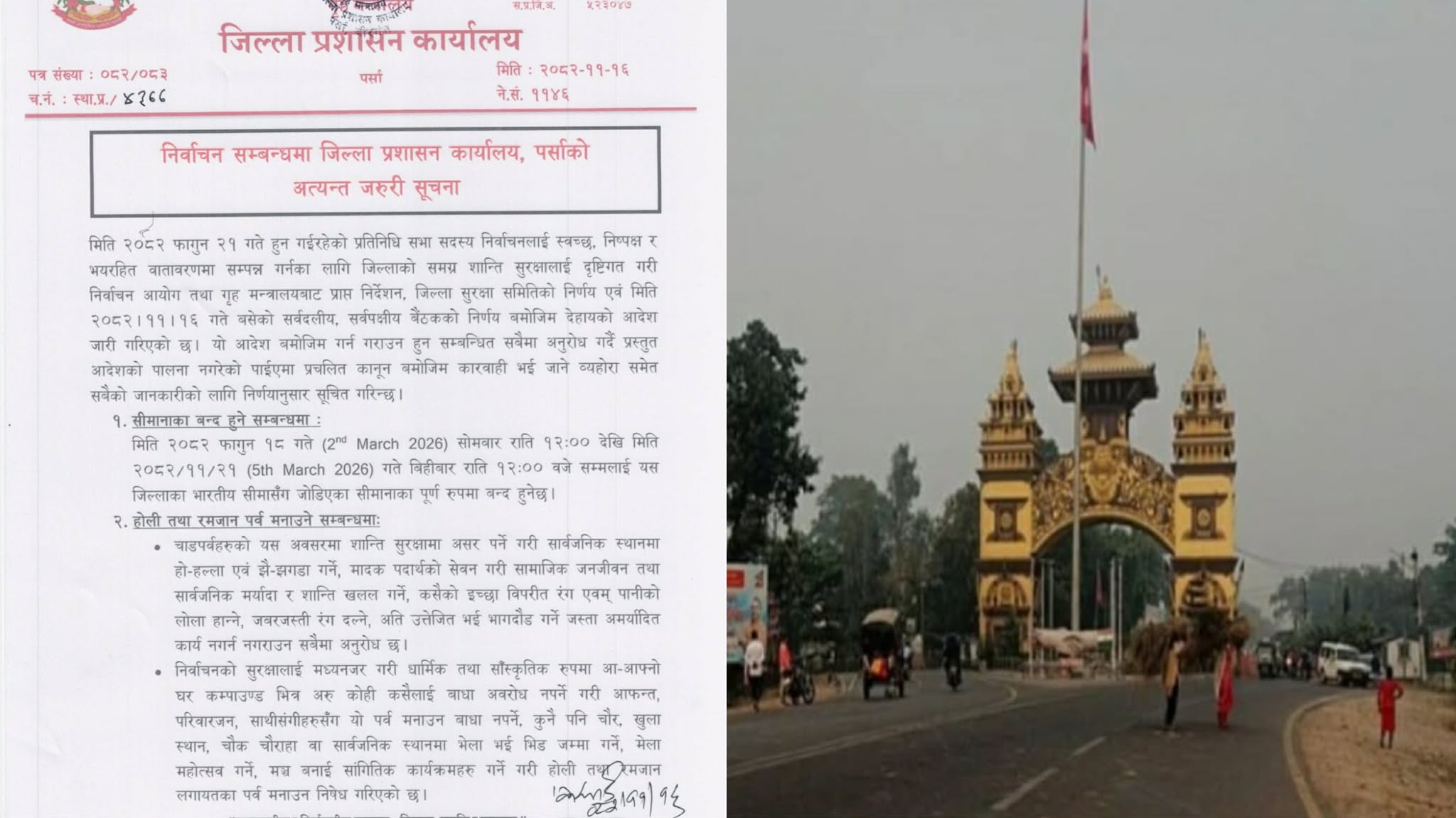 निर्वाचनको बेला पर्सामा ४ दिन सीमा बन्द, होली र रमजान शान्तिपूर्ण रूपमा मनाउन आग्रह