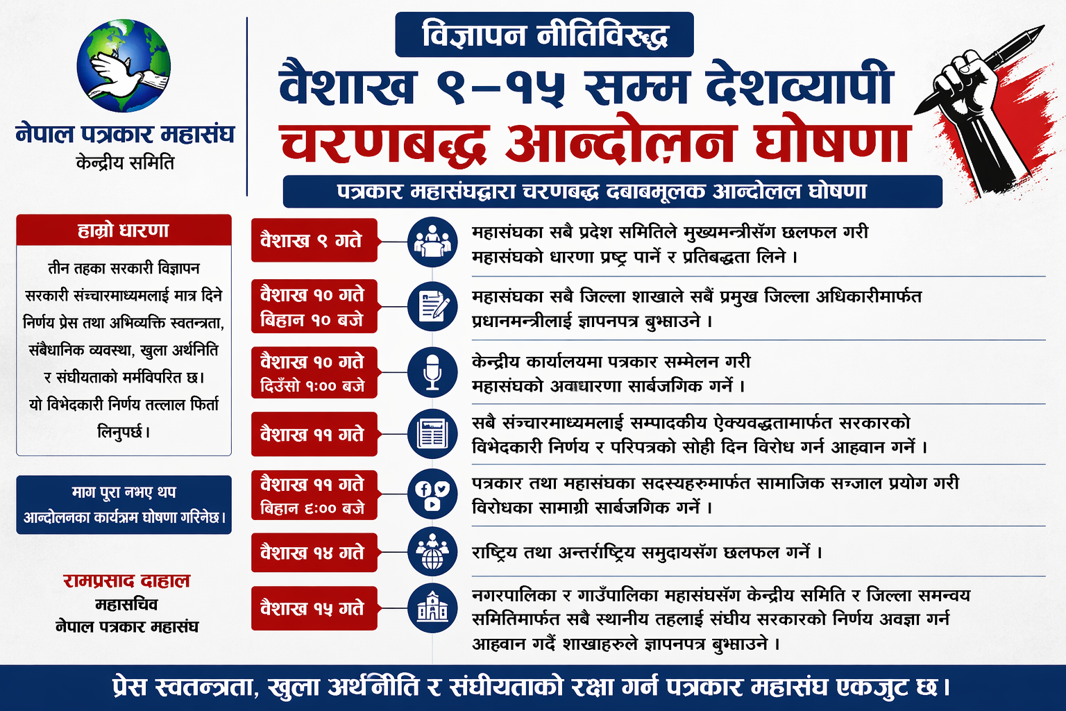 यस्तै, वैशाख ११ गते सबै सञ्चारमाध्यमलाई सम्पादकीय ऐक्यबद्धतामार्फत विरोध जनाउन आह्वान गरिएको छ भने बिहान ८ बजे पत्रकार तथा सदस्यहरूले सामाजिक सञ्जालमार्फत विरोधका सामग्री सार्वजनिक गर्ने कार्यक्रम छ। वैशाख १४ गते राष्ट्रिय तथा अन्तर्राष्ट्रिय समुदायसँग छलफल गरिनेछ भने वैशाख १५ गते स्थानीय तहलाई संघीय सरकारको निर्णय अवज्ञा गर्न आग्रह गर्दै ज्ञापनपत्र बुझाइने महासंघले जनाएको छ।