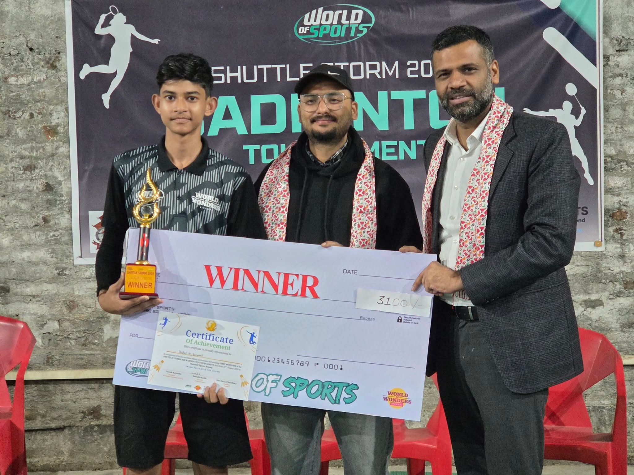 वीरगन्ज–१५ स्थित प्रतिमा चोकमा रहेको रोयल एकेडेमीका कक्षा ९ का विद्यार्थी कुशल कुमार बर्नवाल ले अन्तर–विद्यालयस्तरीय प्रतिष्ठित “SHUTTLE STORM” ब्याडमिन्टन प्रतियोगिता मा उत्कृष्ट प्रदर्शन गर्दै विद्यालय र अभिभावकको गौरव बढाएका छन्।
