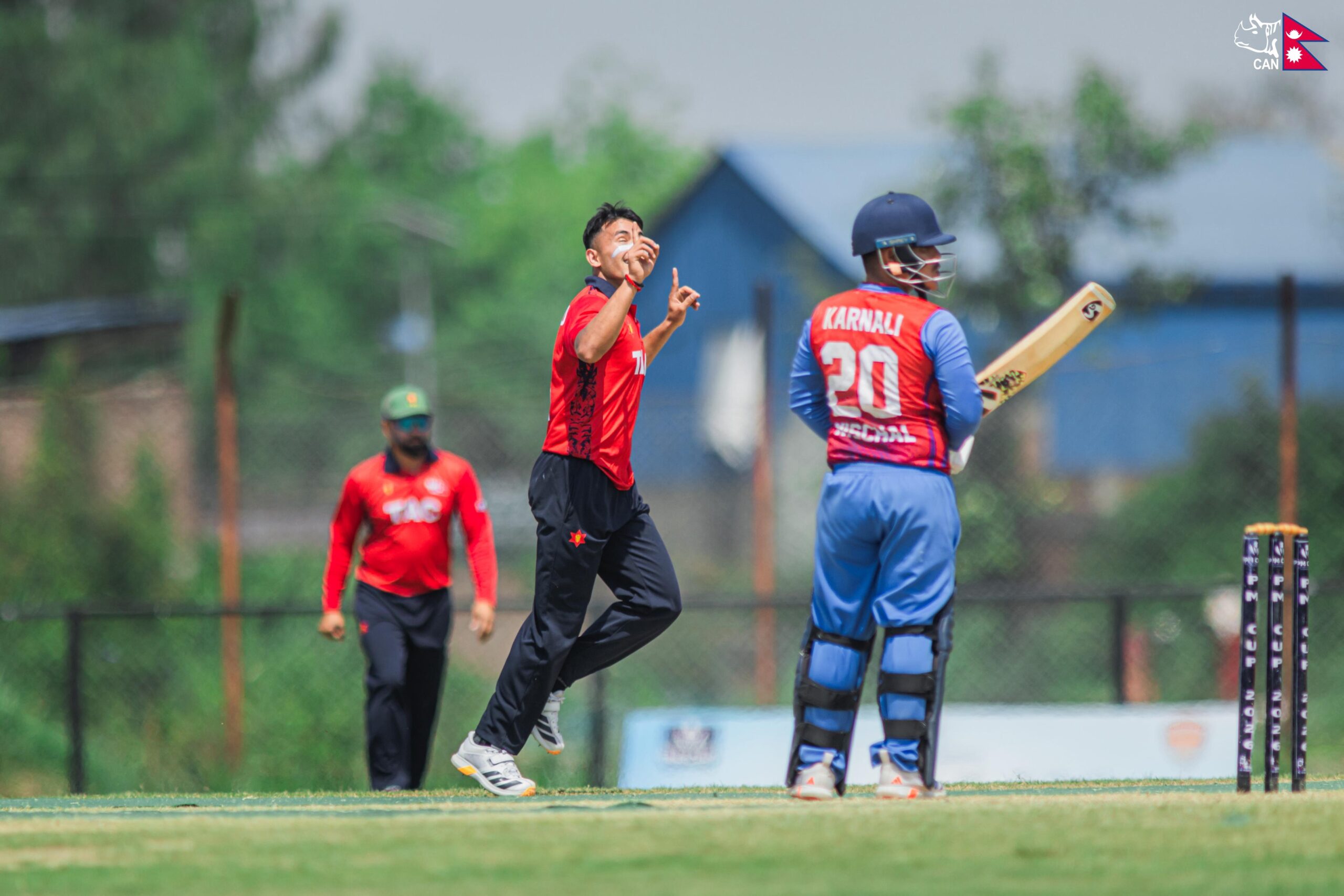 कर्णाली प्रदेशका लागि दिनेश अधिकारीले ४ विकेट लिँदा विकास जैसीले ३ विकेट हात पारे।