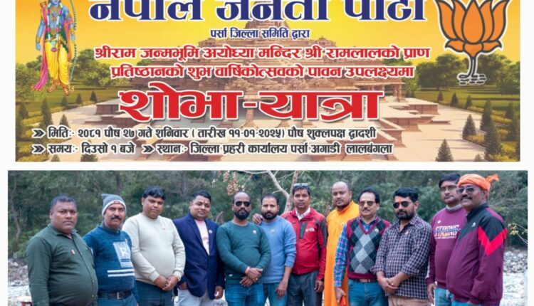 भगवान् श्रीरामको सम्मानमा नेजपाले शोभा यात्रा कार्यक्रम गर्ने भएको छ। नेपाल जनता पार्टी पर्सा जिल्ला समितिले श्रीराम जन्मभूमि अयोcध्या मन्दिर श्री रामलालको प्राण प्रतिष्ठानको शुभ वार्षिकोत्सवको पावन उपलक्ष्यमा पूस २७ गते शनिवार बीरगंजमा शोभा(यात्रा कार्यक्रम गर्ने भएको छ। कार्यक्रम भव्य बनाऊंन आज नेजपा पार्टीका अगुवाहरुको बैठक रानीसती मन्दिर बीरगंजमा सम्पन् भएको छ।