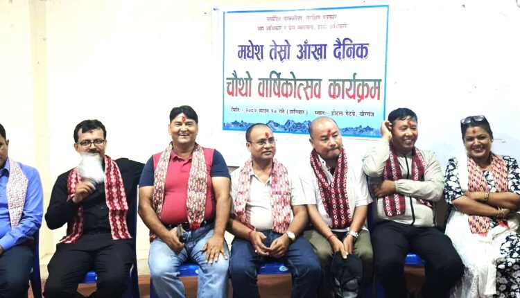 वीरगंजबाट प्रकाशन हुँदै आएको मधेश तेस्रो आँखा दैनिक को चौथो वार्षिकोत्सव शनिबार भव्य रूपमा सम्पन्न भएको छ। वीरगंजस्थित होटल वीरगंज गेटवेमा आयोजित समारोहमा पत्रकारिता क्षेत्रका विशिष्ट व्यक्तित्वहरूको उपस्थिति रहेको थियो ।
