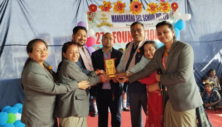 बीरगञ्ज महानगरपालिका वडा नम्बर ५ मा अवस्थित मनकामना बोर्डिङ स्कुलले आज आफ्नो २७ औँ वार्षिक उत्सव भव्य समारोहको माध्यमबाट सम्पन्न गरेको छ। कार्यक्रममा विद्यालयका सञ्चालक एवं प्रिन्सिपल पुरन प्रधानको सभापतित्व तथा निजी तथा आवासीय विद्यालय अर्गनाइजेसन नेपाल (प्याप्सन) बीरगञ्ज महानगरका अध्यक्ष राहुल श्रीवास्तवको प्रमुख आतिथ्य रहेको थियो।