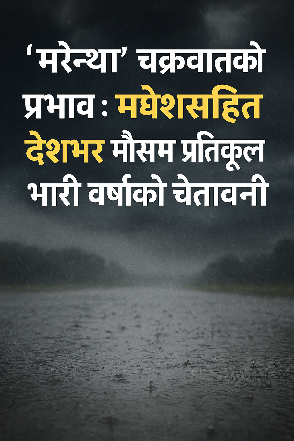 बङ्गालको खाडीमा विकसित भएको चक्रवात ‘मोन्था’ र पश्चिमी वायुको संयुक्त प्रभावका कारण मधेश प्रदेशसहित देशका धेरै भागमा मौसम प्रतिकूल बनेको छ। मौसम पूर्वानुमान महाशाखाका अनुसार, उक्त मौसमी प्रणाली कमजोर हुँदै हाल न्यूनचापीय क्षेत्रको रूपमा नेपालको मध्य भू–भाग नजिक आइपुगेको छ। यस प्रणालीको सीधा असर विशेष गरी मधेश प्रदेशमा पर्ने अनुमान गरिएको छ।