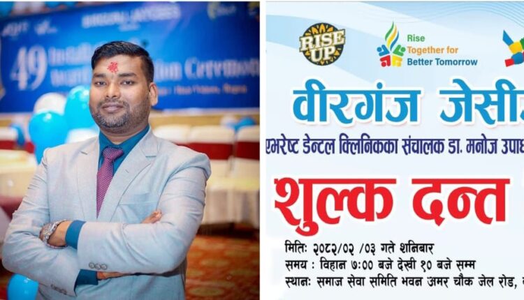 वीरगंज जेसीजले आगामी जेठ ३ गते शनिबारका दिन निःशुल्क दन्त स्वास्थ्य जाँच शिविरको आयोजना गर्ने