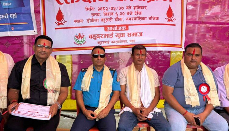वीरगन्ज । पर्साको बहुदरमाई नगरपालिका वडा नम्बर ४ को डोकैला चोकमा बहुदरमाई युवा समाजले आयोजना गरेको रक्तदान कार्यक्रममा ५२ जनाले रक्तदान गरेका छन्। यसमध्ये एक जना महिलाले पनि रक्तदान गरेकी छन्।
