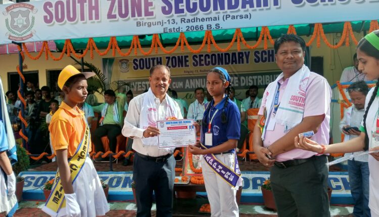 वीरगञ्ज– बीरगंज महानगरपालिका वडा नम्बर १३ राधेमाई स्थितमा रहेको साउथजोन माध्यमिक बिधालयका विद्यार्थीहरुको सपथग्रहण तथा गतवर्ष विभिन्न क्षेत्रमा उत्कृष्ट भएका विद्यार्थीहरुलाई मंगलबार एक समारोहबीच प्रमाणपत्र तथा मायाको चिनोले सम्मानित गरिएको छ।