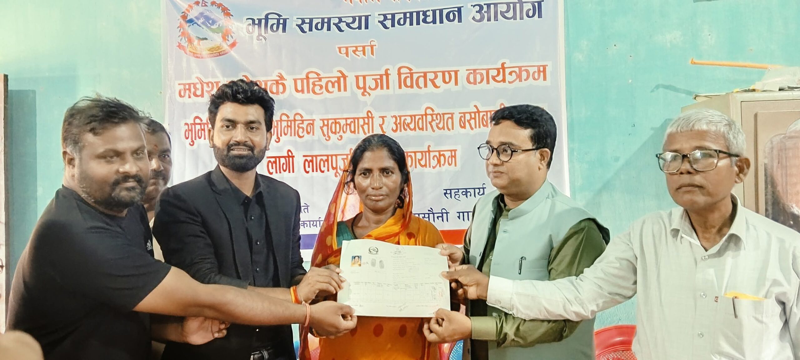भूमि समस्या समाधान आयोग, पर्साले सखुवा प्रसौनी गाउँपालिका–१ का भूमिहीन तथा अव्यवस्थित बसोबासीलाई जग्गाको लालपुर्जा वितरण गरेको छ। शनिबार आयोजित विशेष कार्यक्रममा ७ अव्यवस्थित परिवार र ३७ भूमिहीन दलित तथा सुकुम्वासी गरी ४४ जनालाई कानुनी स्वामित्वको प्रमाणपत्र प्रदान गरिएको हो।