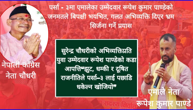 वीरगञ्ज । पर्सा जिल्लाको निर्वाचन क्षेत्र नम्बर–३ मा प्रतिनिधिसभा निर्वाचन नजिकिँदै जाँदा राजनीतिक बहस तीव्र बन्दै गएको छ। यही सन्दर्भमा नेकपा एमालेका तर्फबाट परिवर्तनका संवाहक युवा उम्मेदवार रूपेश कुमार पाण्डेले नेपाली काँग्रेसका पूर्वमन्त्री तथा पर्सा–३ का उम्मेदवार सुरेन्द्र कुमार चौधरीको हालैको अभिव्यक्तिप्रति कडा आपत्ति जनाएका छन।