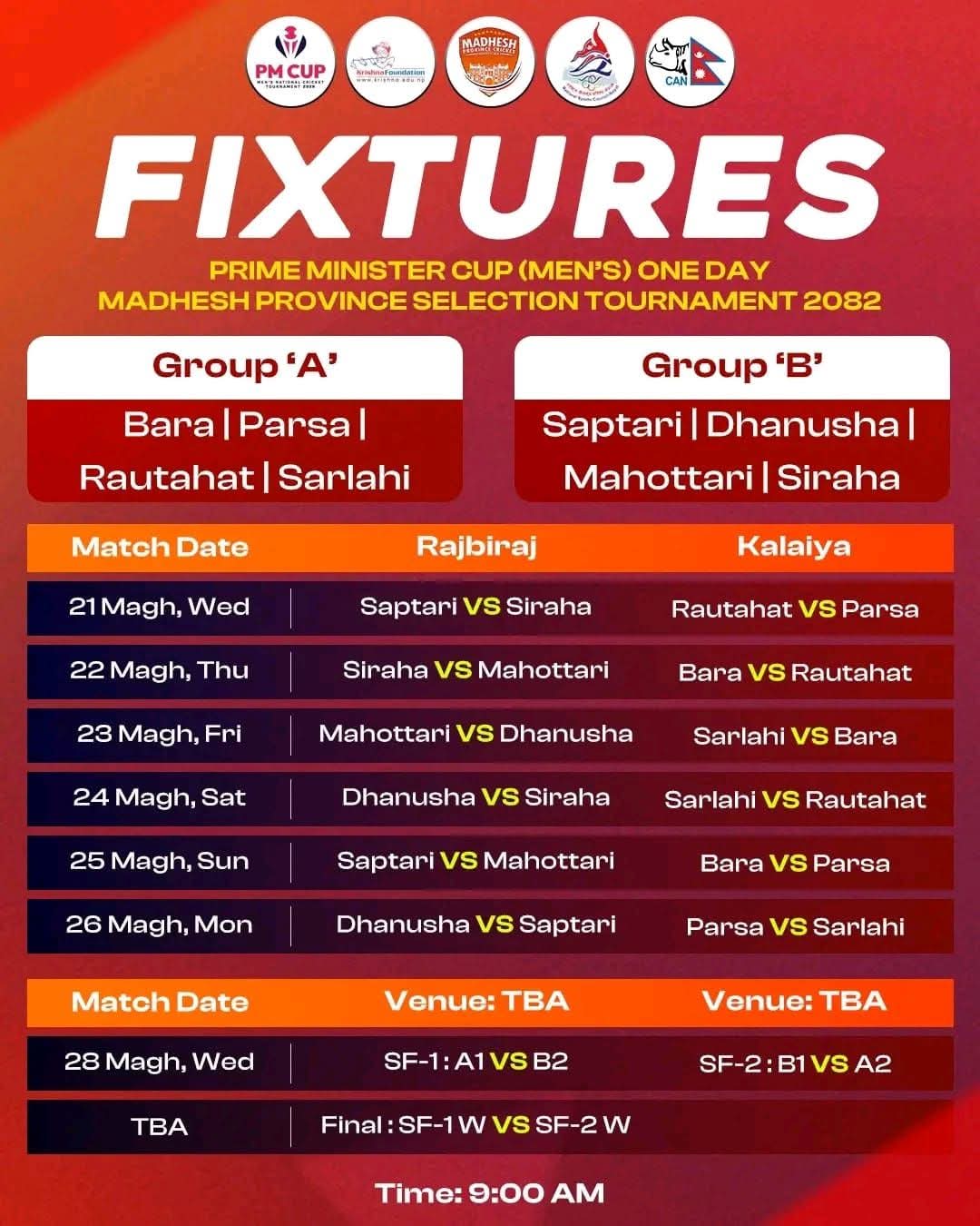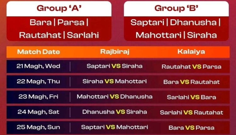 सार्वजनिक गरिएको फिक्स्चर अनुसार प्रतियोगितामा मधेश प्रदेशका आठ जिल्लाका टोलीहरू सहभागी हुँदैछन्। समूह ‘ए’ मा बारा, पर्सा, रौतहट र सर्लाही तथा समूह ‘बी’ मा सप्तरी, धनुषा, महोत्तरी र सिरहा रहेका छन्। पर्साको टोलीले कालैयामा आफ्ना समूह चरणका खेलहरू खेल्ने तालिका छ।