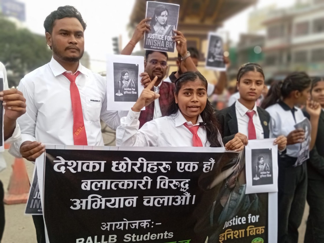 वीरगन्ज स्कुल अफ ल मा कानुन संकायमा अध्ययनरत युवा–युवतीहरूले साँझ घण्टाघर चोक मा प्रदर्शन गरेका हुन्। प्रदर्शनमा सहभागीहरूले ‘इनिशाका बलात्कारी तथा हत्यारालाई कारबाही गर’, ‘बलात्कारी र हत्यारालाई फाँसी दे’, ‘देशका छोरीहरू एक होऔँ, बलात्कारीविरुद्ध अभियान चलाऔँ’, ‘नेपाली चेली कहिलेसम्म बलात्कृत हुने?’ र ‘नारीको सम्मान गर’ लगायतका नारा लेखिएका प्लेकार्ड बोकेका थिए।