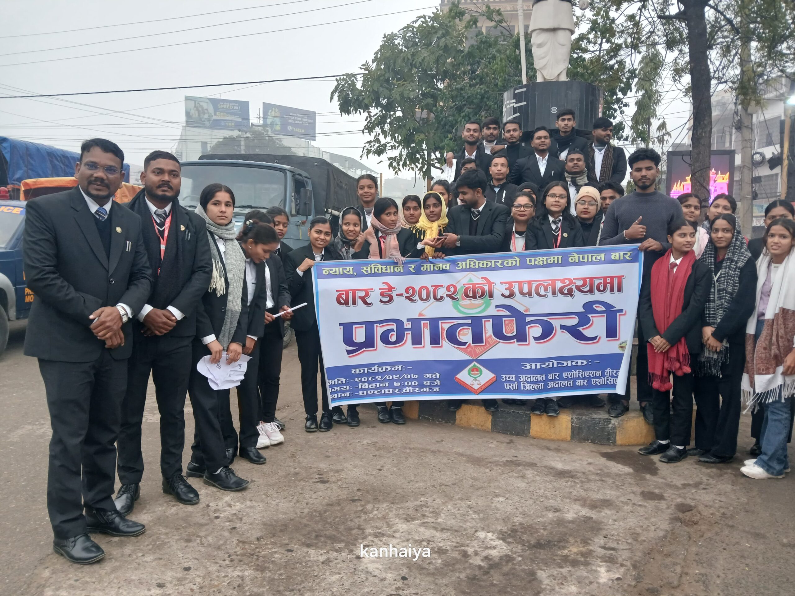 उच्च अदालत बार एसोसिएसन वीरगञ्ज तथा पर्सा जिल्ला अदालत बार एसोसिएसनको संयुक्त आयोजनामा सम्पन्न प्रभातफेरी वीरगञ्जको घण्टाघर चोकबाट सुरु भई वीरगञ्ज बजार परिक्रमा गर्दै पुनः घण्टाघरमै पुगेर सम्पन्न भएको थियो।
