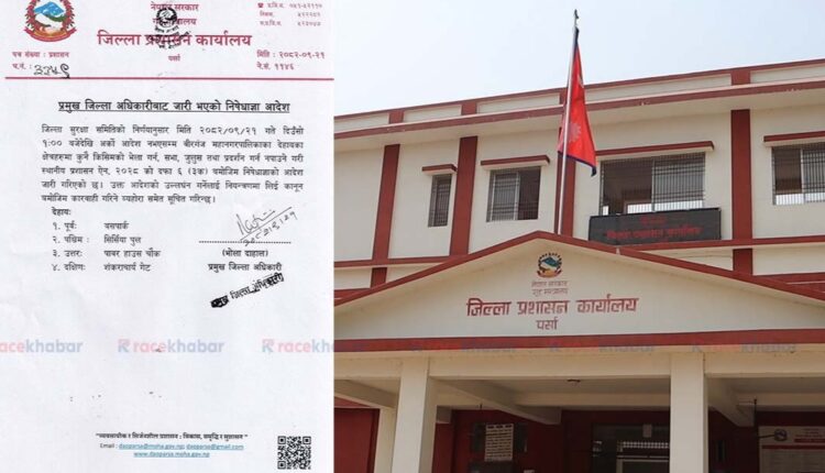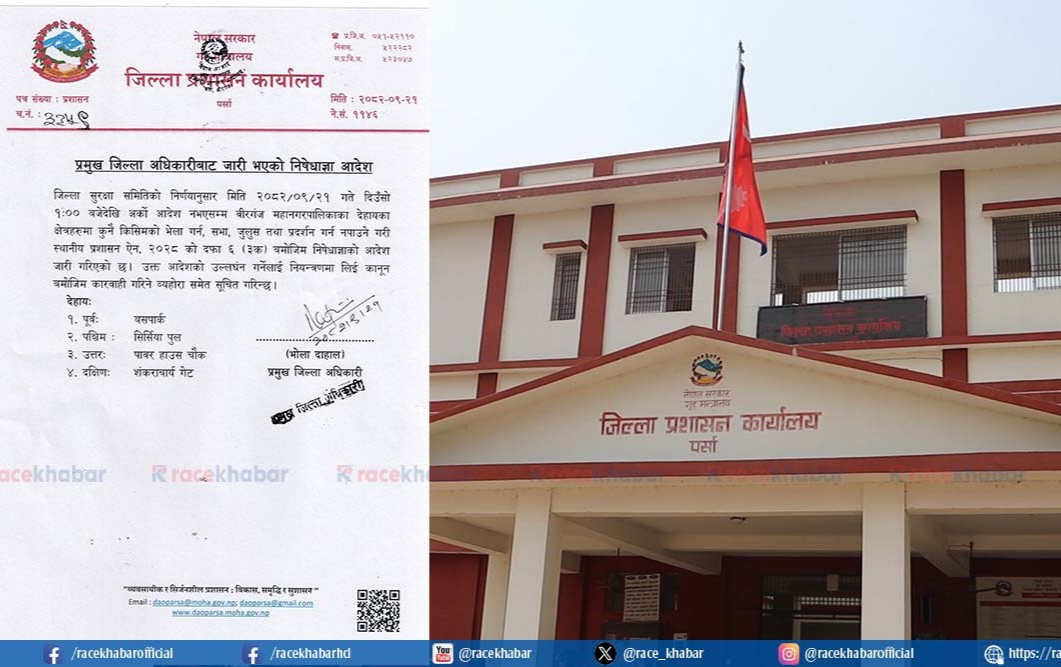 २१ पुस, वीरगञ्ज। जिल्ला प्रशासन कार्यालय पर्साले वीरगञ्ज महानगरपालिकाका विभिन्न मुख्य क्षेत्रमा निषेधाज्ञा जारी गरेको छ। जिल्ला सुरक्षा समितिको निर्णयअनुसार आज मिति २०८२ पुस २१ गते दिउँसो १:०० बजेदेखि अर्को आदेश नभएसम्म लागू हुने गरी निषेधाज्ञा जारी गरिएको हो।