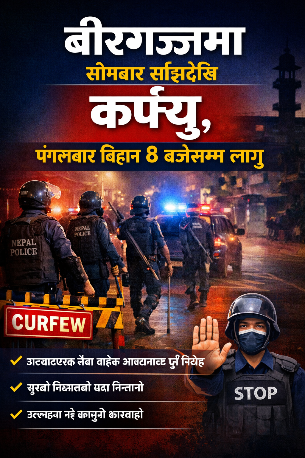 वीरगन्जमा सोमबार साँझदेखि कर्फ्यु, मंगलबार बिहान ८ बजेसम्म लागू