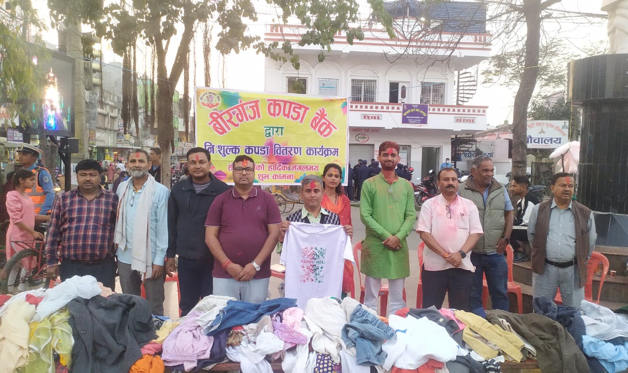 हर्षोल्लास एवं आपसी एकता–भाइचाराको महापर्व होलीको पूर्वसन्ध्यामा आइतबार शुभकामना आदान–प्रदानसँगै वीरगन्ज कपडा बैंकले वीरगन्जको घण्टाघर क्षेत्रमा करिब ८ सय थान नयाँ तथा पुराना कपडा नि:शुल्क वितरण गरेको छ।